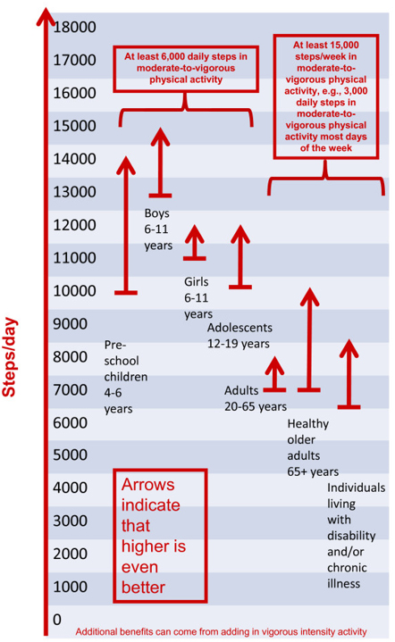 高齢者および運動や身体的耐久力に限界のある身体障害や慢性疾患を持つ特別な集団は身体的活発な生活習慣を増加させること、特に歩行活動を増加させることから恩恵を得ることが出来る。一日何歩あるいたらいいかというと、標準的には高齢者は2000-9000歩/日、上記特別な集団は1200-8800歩/日である。歩数計を使用することにより高齢者は775歩/日、特別な集団は2215歩/日の増加がみられた。歩く速度は100歩/分、これはゆっくり歩くと普通に歩くの丁度境目で、3000歩/30分が経験的に薦められている。しかし、身体的障害のあるまたは疾患を持つ人では実行できない場合があるだろう。しかし、この程度の運動を少なくとも1回に10分継続すること、週に150分行うことが推奨されている。結論として、高齢者は7000~10000歩/日で、30分の中強度速度の歩きを含むことが推奨される。しかし、運動や身体的耐久力に限界のある身体障害や慢性疾患を持つ特別な集団はさらに低いレベルにする必要がある。