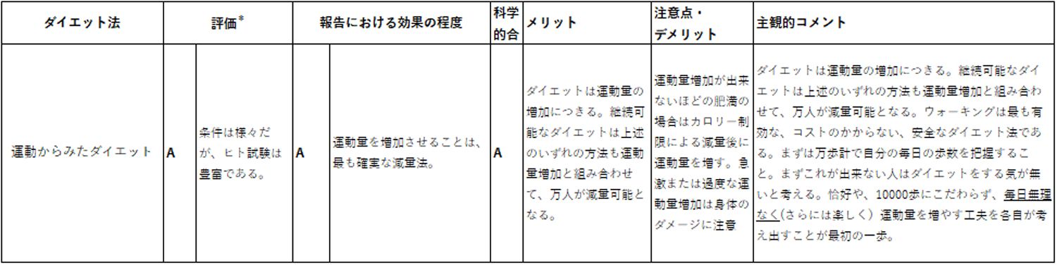 以上、効果、経済性、安全性から考えて、ウォーキングを中心に身体活動量を増加させることが、体重減少には最も選択されるべき方法と思われる。10000歩/日という目標はヒトによっては高いハードルである。都会のコンクリ―道路をただ歩くことだけを目的に毎日10000歩、歩くことは拷問に近い。この10000歩/日という数字にとらわれたり、brisk walking(きびきびとしたウォーキング)でないと意味ないと思ったりする必要はない。強度より頻度(日常化すること)、現状より1000歩程度増やしてみること、すくなくとも万歩計で自分の状態を常に把握することが<はじめの一歩>と思われる。