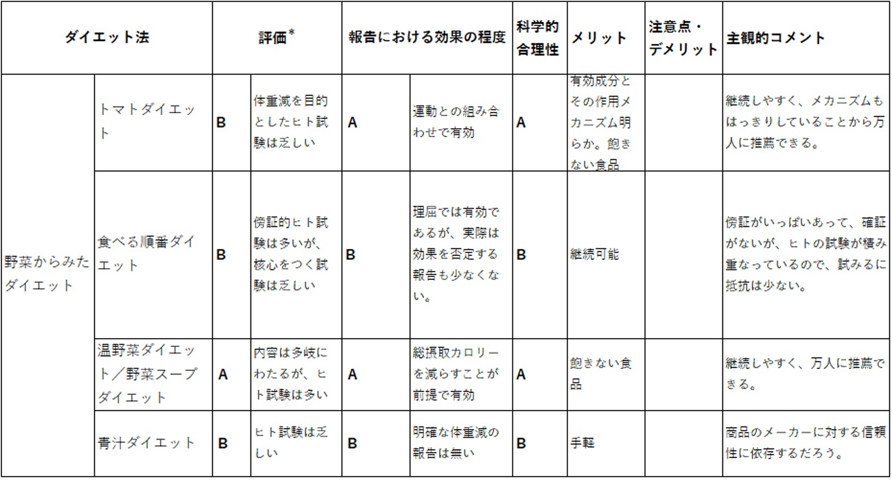 低カロリーの野菜を多く食べることは体重増加を抑えるに有効であり、その理由は主として油や肉の量を減らしても野菜が十分あると満腹感/満足感を得られることにある。スープという形はその内容にかかわらず満腹感/満足感を増加して、総摂食量を下げることが出来る。これより野菜スープが体重増加抑制に有効であること、野菜を大量に継続的に食べるには野菜スープや温野菜とすることがダイエットには実際的である。
