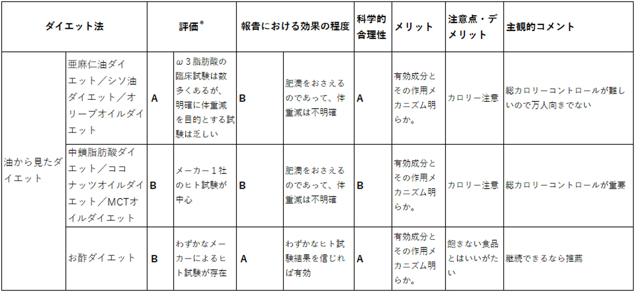 油から見たダイエットは短鎖脂肪酸、中鎖脂肪酸、長鎖脂肪酸(オメガ3)はそれぞれ効果を表すためのメカニズムが大きく違う。同じ量摂取するなら、一般の油(オメガ6長鎖脂肪酸)を摂取するよりは中鎖脂肪酸やオメガ3長鎖脂肪酸含有油を使う方が体重を増加させないためにはベターである。お酢の摂取は積極的体重減少が期待できる。いずれにせよ、通常摂取カロリーに上乗せして、総カロリー・オーバーになっては意味ないし、長期摂取し続けられるかが重要である。